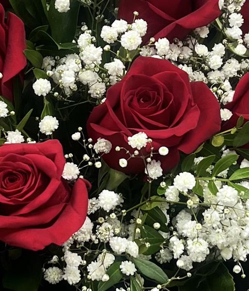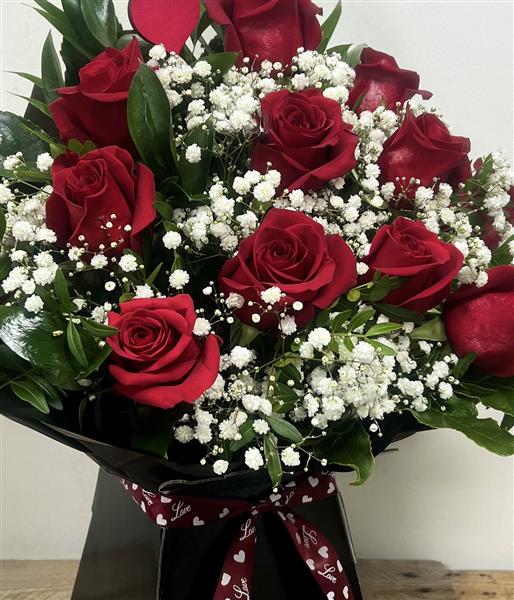 A classis bouquet including 12 red roses, mixed greenery and gpysophila.