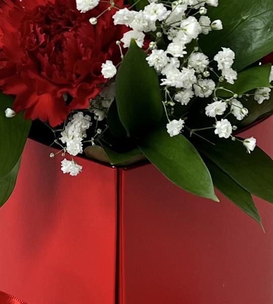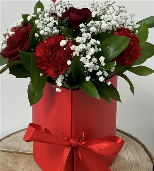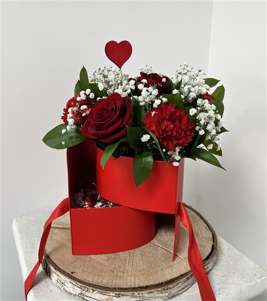 Red heart shaped hat box with red roses, red carnations, gyp and a box of Lindt chocolates inside.