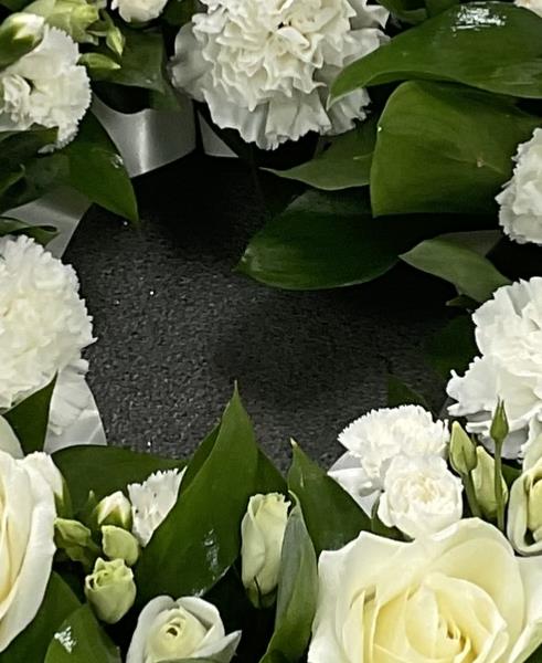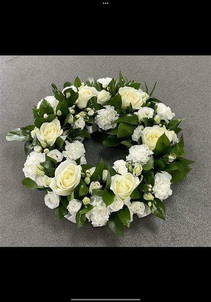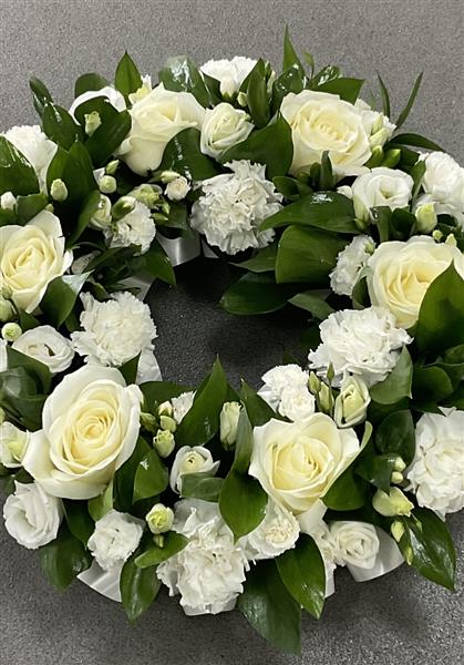 Cream and white wreath including cream roses, white carnations, white eustoma and greenery.