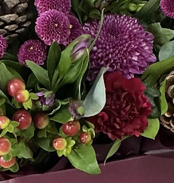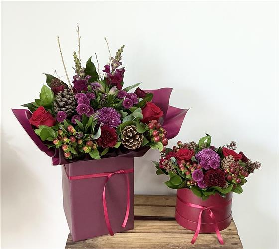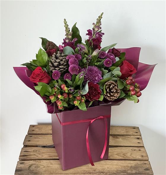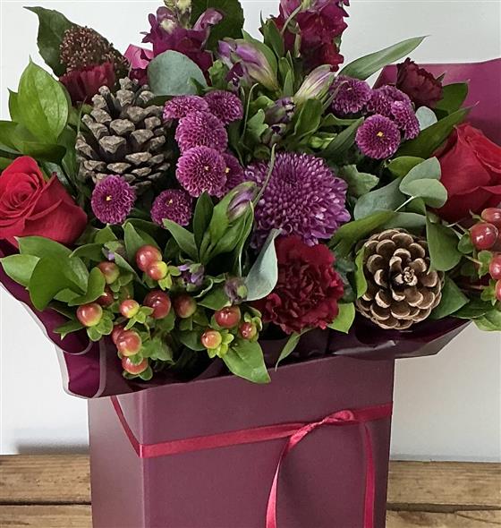 Christmas bouquet in a burgundy gift box including
