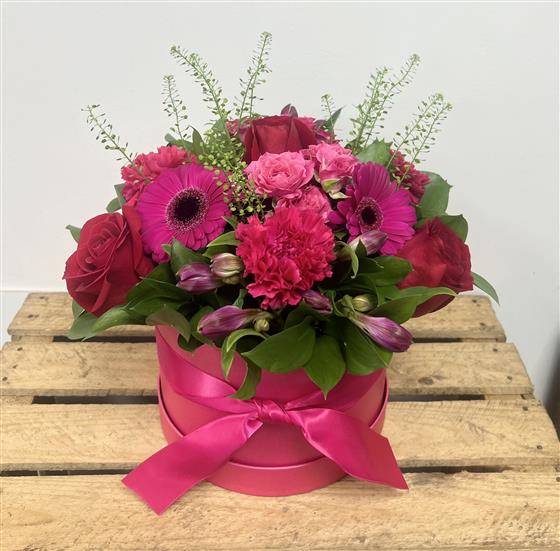 Cerise hat box with cerise and red flowers including